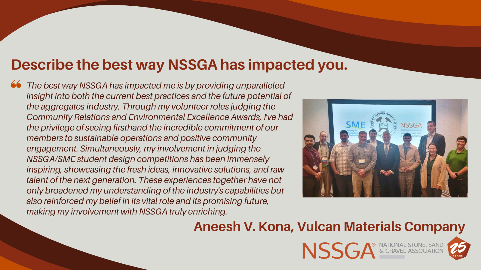The aggregates industry is a part of everyone's life. Whether it's by producing the aggregates that build a local school or hospital or sponsoring the local Little League team, NSSGA Member Companies are important members of their communities. For the past 25 years, and even before the association's formation, aggregates producers and industry manufacturing and service providers have been involved in supporting the local community.